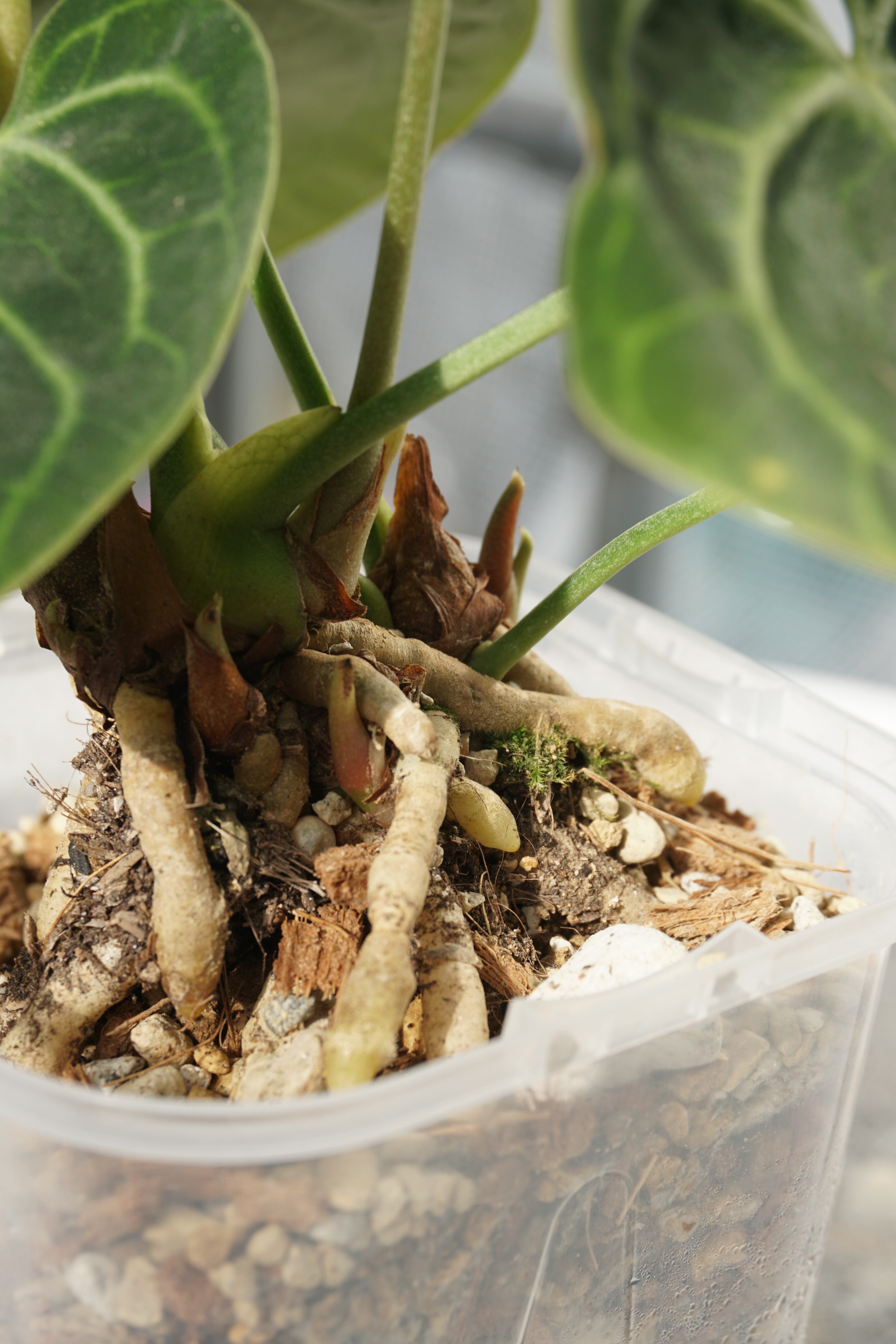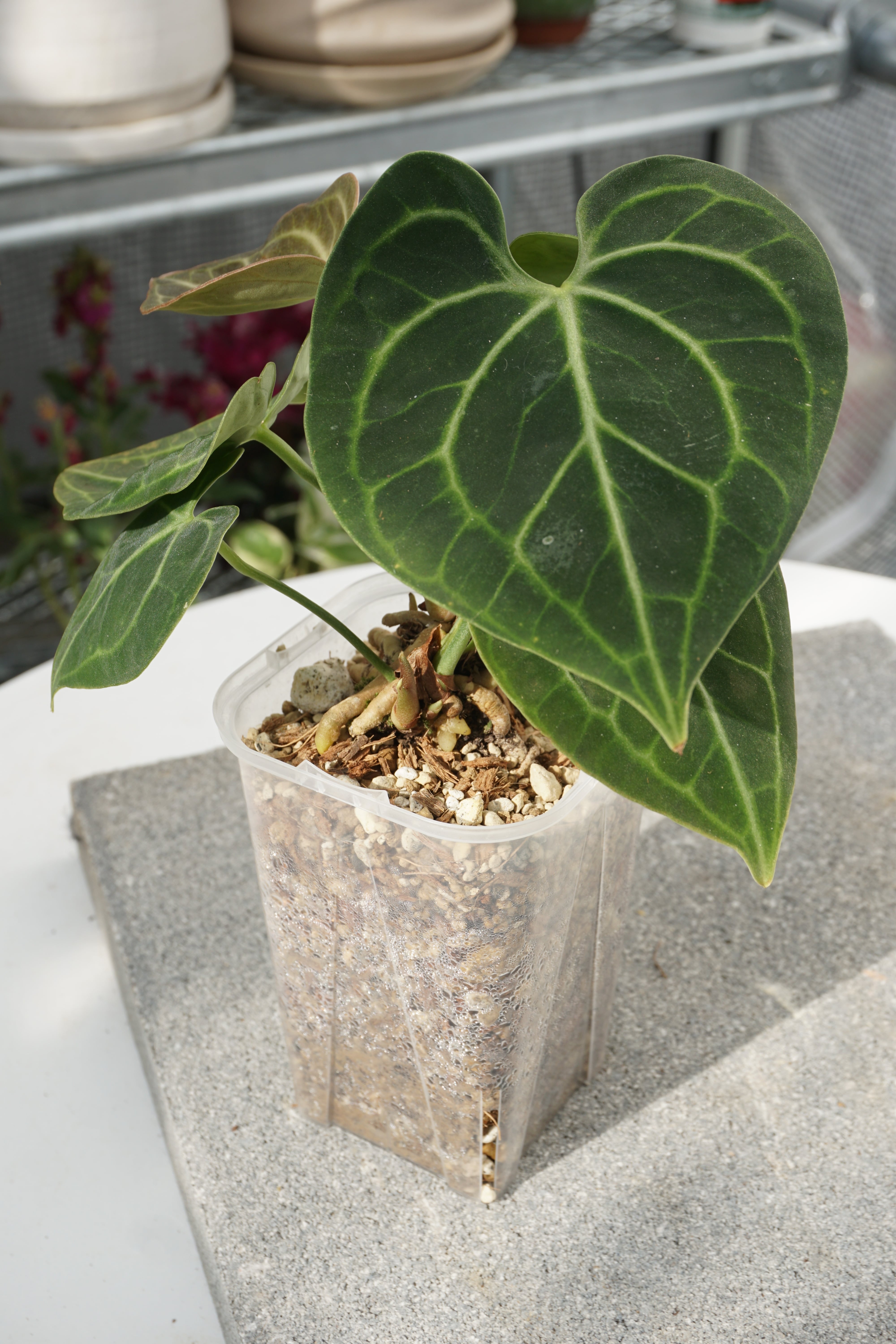 アンスリウム・クラリネルビュームは、深いベルベットグリーンに白い葉脈がくっきり走る、まるでアート作品のような存在感を持つ品種です。今回の個体は葉の形が整い、葉脈のコントラストも美しく、厚みとハリがある上質な株。あと、この個体は葉がハート型なのも特徴です。
